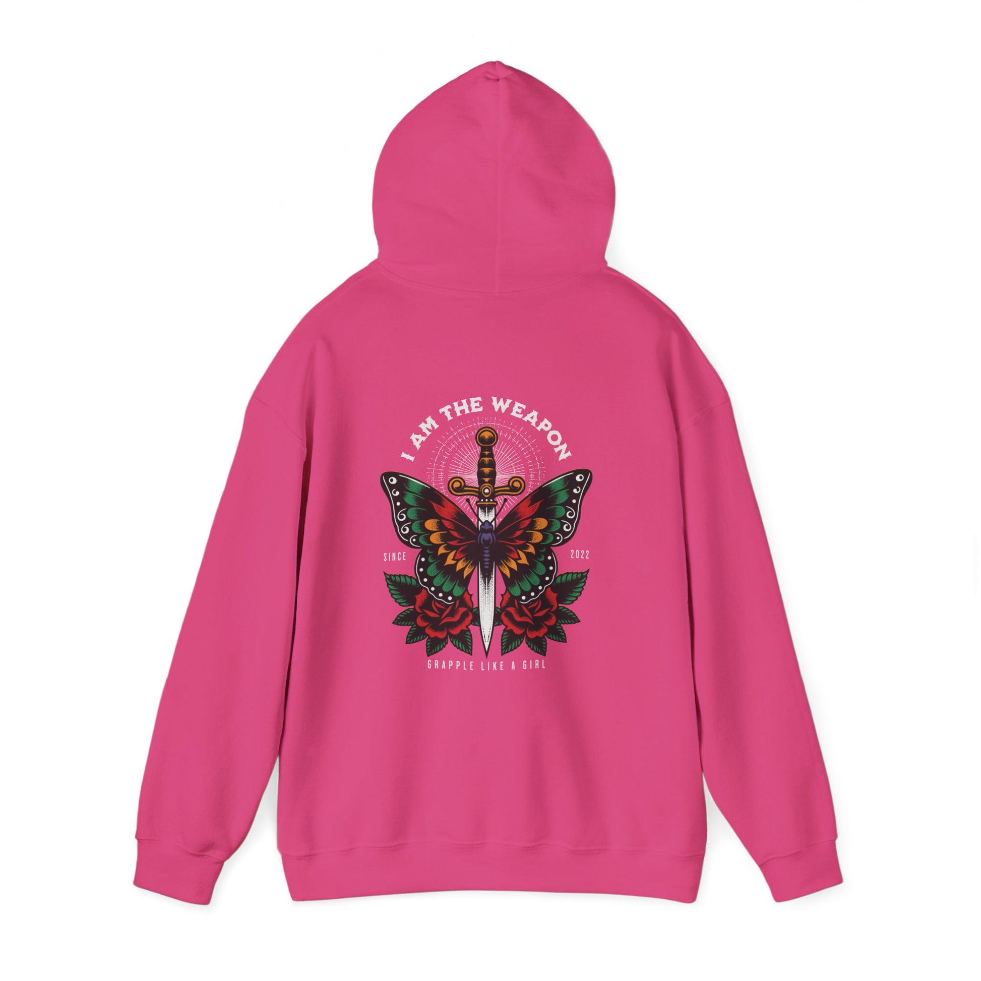 This unisex heavy blend hooded sweatshirt is relaxation itself. This comfy hoodie features our "I am the weapon." design on the back and a pocket sized logo on the front. Made with a thick blend of cotton and polyester, it feels plush, soft and warm, a perfect choice for any cold day. In the front, the spacious kangaroo pocket adds daily practicality while the hood's drawstring is the same color as the base sweater for extra style points. See a design you like but want it on a different product? Shoot me a message, I am happy to put something together for you!